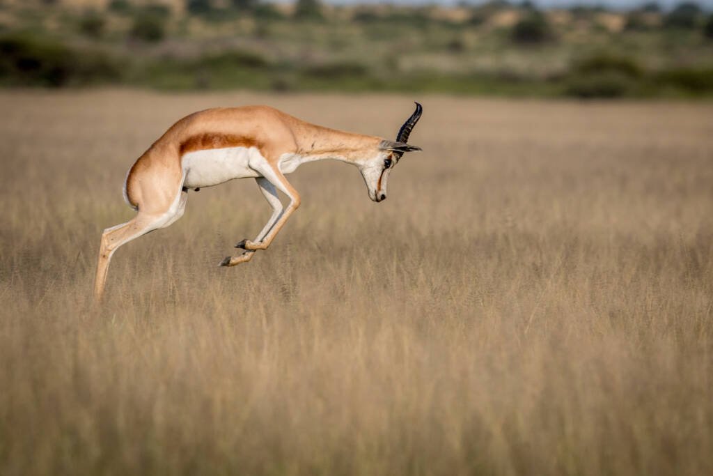 Wenn ein Springbock erschrickt oder einfach nur verdammt gute Laune hat, macht er etwas Einzigartiges: Er springt mit steifen Beinen bis zu 3,50 Meter hoch in die Luft. Dabei krümmt er den Rücken und klappt eine versteckte weiße Fellfalte auf dem Rücken aus.